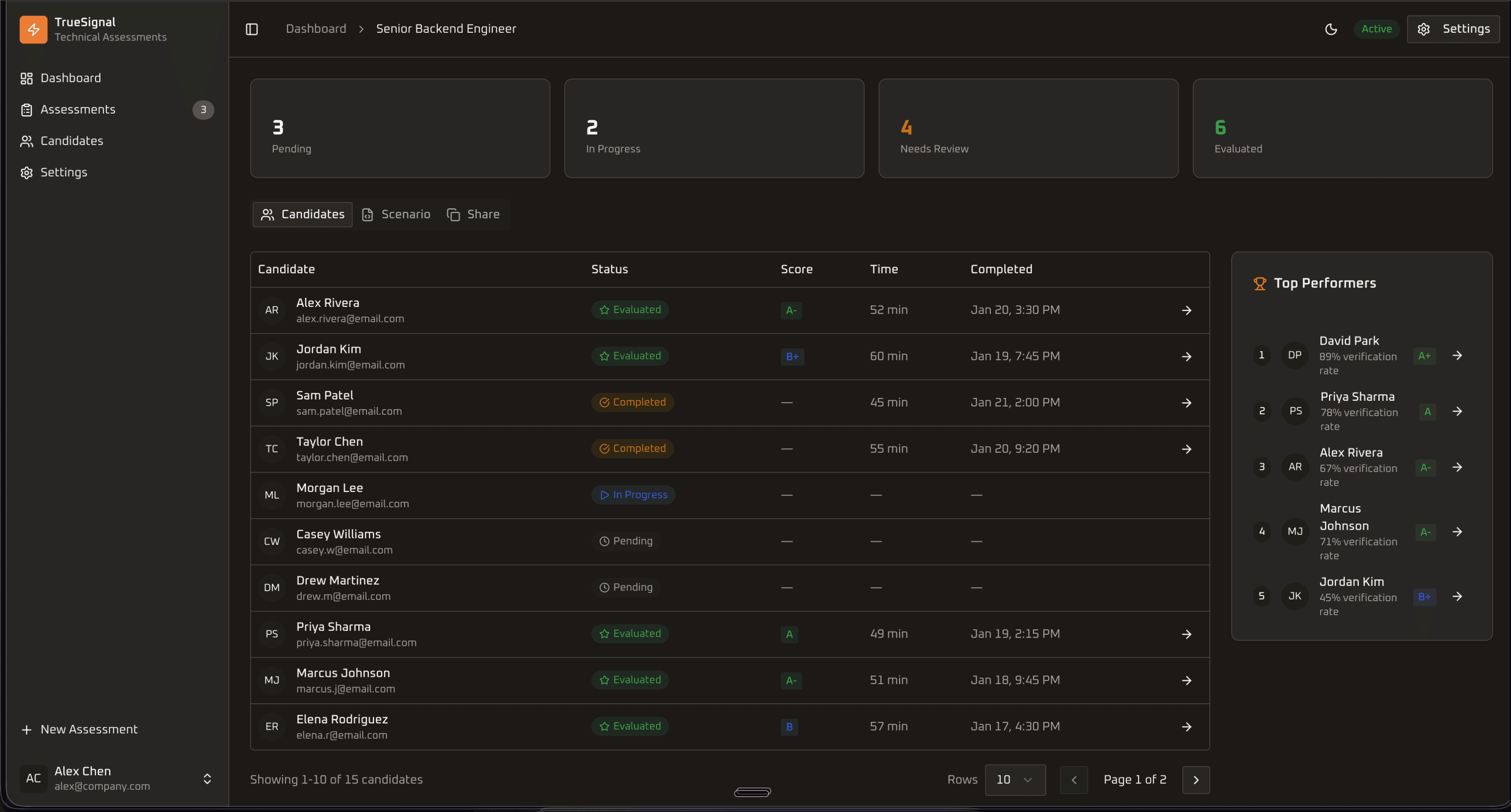 TrueSignal reflects how engineers actually build — from understanding requirements to reviewing code and explaining decisions.